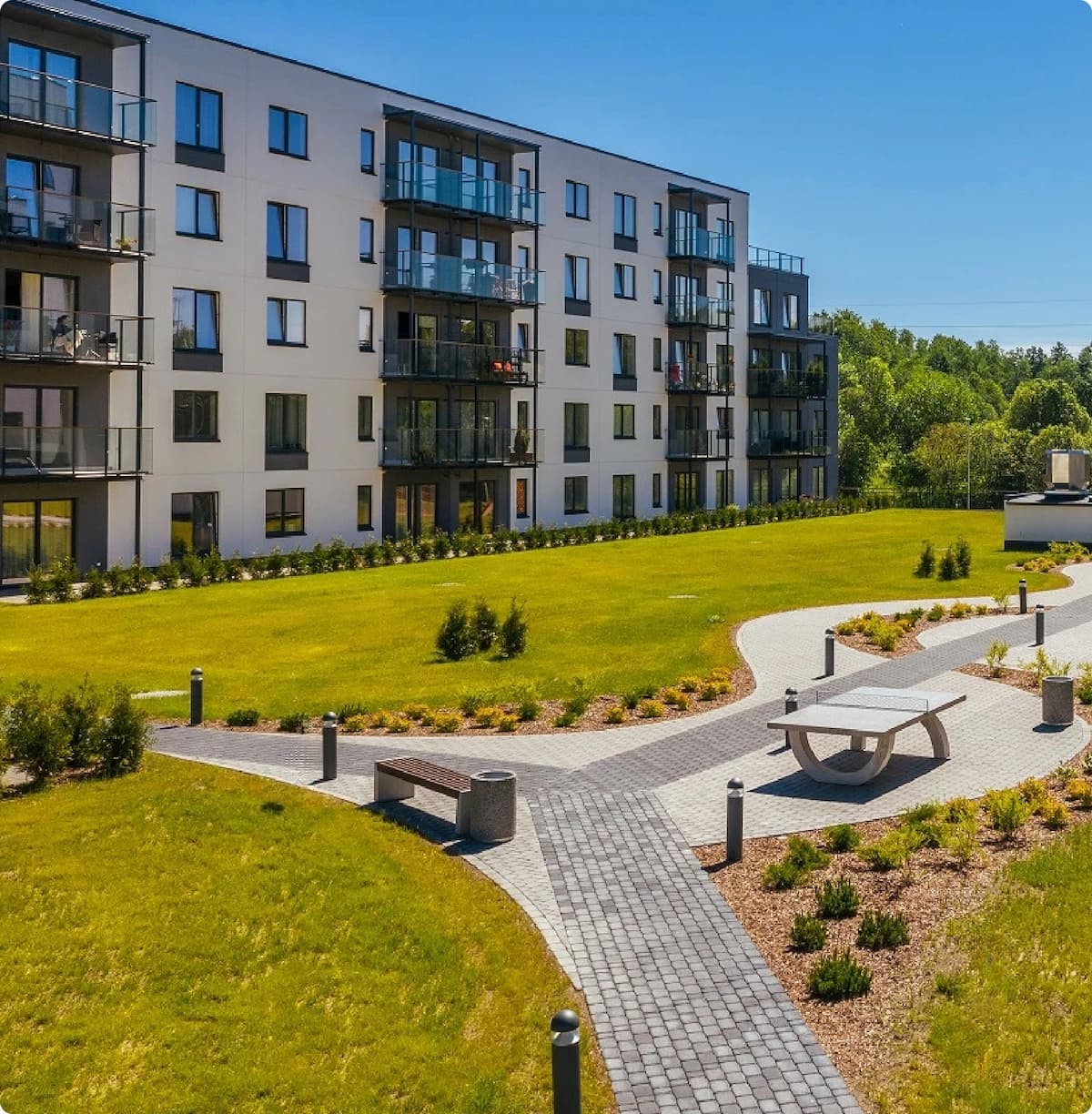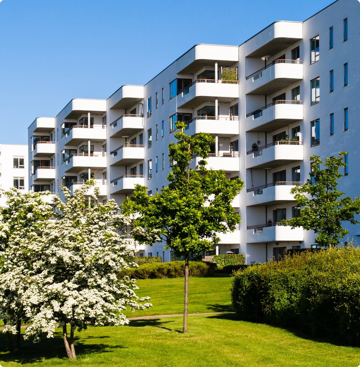 Landscaping with trees, bushes, and green courtyards surrounds the homes, with paths opening toward a nearby lake. This reflects Nordic respect for nature — urban life intertwined with calm, clean spaces — offering beauty, balance, and restoration after war.
